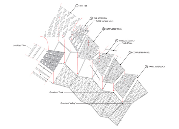 The dramatic shell form of the Bloom pavilion can suggest that its simply one cutting-edge piece of digitally computed design, but the real and slow innovation is happening in the layer of metal panels, which are bending according to heat levels generated by the sun. The form’s responsive surface is made primarily out of 14,000 smart thermo bi-metal tiles, where no two pieces are alike. Each individual piece automatically curls a specified amount when the outdoor ambient temperature rises above 70F or when the sun penetrates the surface. Bloom is, according to Sung, the first architectural application of the laminated metal material, which includes nickel and manganese with a bit of iron – the material is typically used in industrial applications.